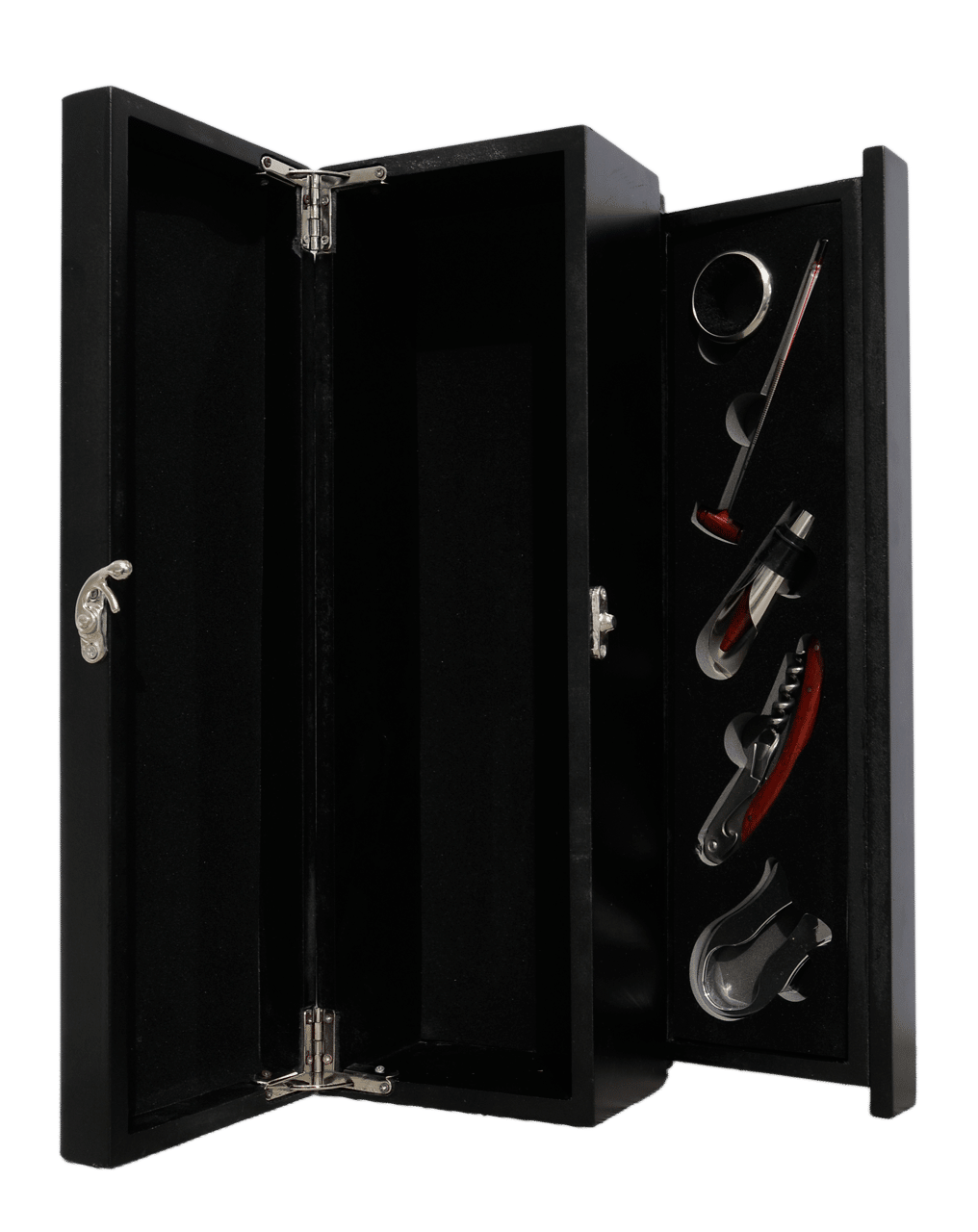 Een zwart gelakte houten kist met slotje en onderin een lade met 6 attributen om een fles wijn te openen, uit te serveren en opnieuw af te sluiten. Tevens zit er ook nog een thermometer in. Kortom een schitterende verpakking om een fles cadeau te geven!.